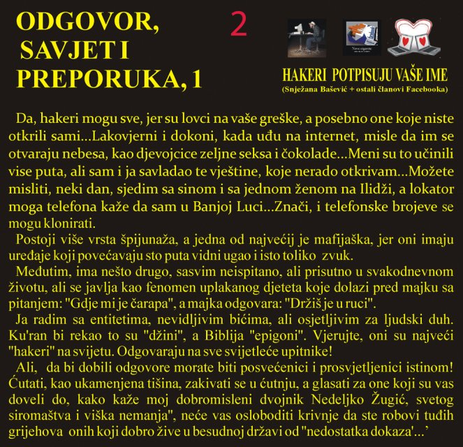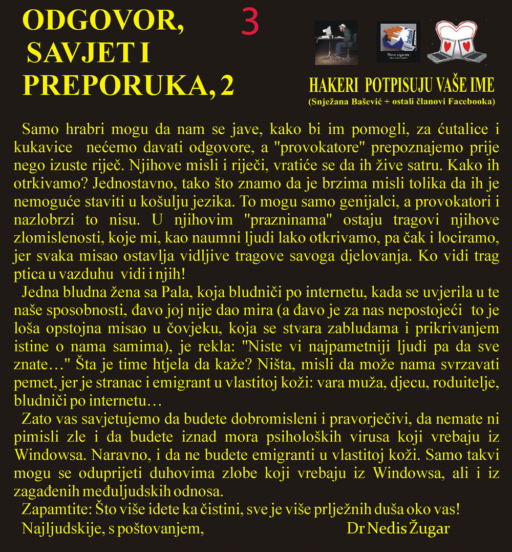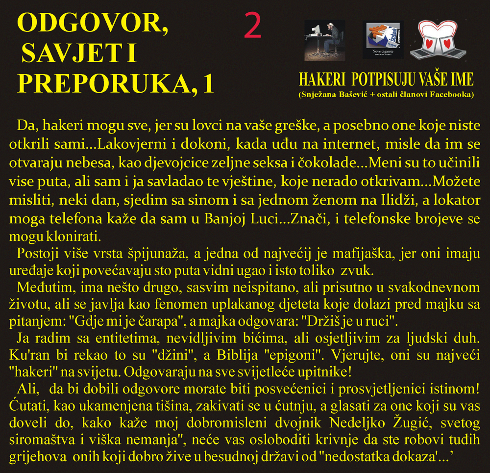 Problemi prate sve društvene strukture, a posebno omladinu – jer im je ukradena budućnost, nezaposlene – jer su dovedeni u bezizlaznu situaciju, penzionere – jer im je ukradena prošlost (minuli rad), a da ne govorimo o tome kako se osjećaju djeca i supruge poginulih boraca, ratni vojni invalidi, izbjeglice koje su krenule nigdje, nikuda i nikome... Sve to nije metafora, već ravan govor, sušta zbilja sumorne stvarnosti koja najavljuje još tamnije dane.